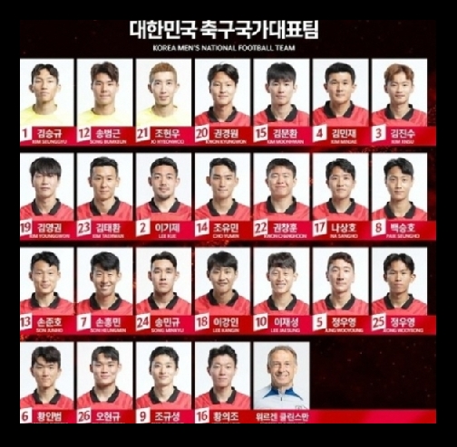 김승규, 이용, 김진수, 김민재, 정우영, 황인범, 조규성, 이재성, 황의조, 김영권, 권창훈 이렇게 스타팅 멤버입니다. 며칠전 레바논전에서 황의조와 조규성의 투톱이 재미를 봤던만큼 이번에도 동일한 전략을 취할 수밖에 없습니다. 콜롬비아전에서 2골이나 득점했던 손흥민 선수가 우루과이전에서도 골맛을 보길 바랍니다.