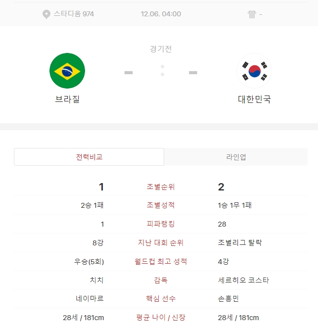 파울루 벤투 감독이 4년 동안 선수들과 훈련해온 전략이 브라질에 통할 수 있을지 기대됩니다. 대한민국은 28위고 브라질 피파랭킹은 1위 입니다. 2022년 6월에 열린 친선전에서 1:5로 대패한 바 있습니다. 한국과 브라질의 전력 차이는 당연 합니다. 지금까지 월드컵은 이변이 많았습니다. 32강은 몰라도 16강 이후부터는 선수들의 피로도 누적과 심리적 긴장감 떄문에 축구 잘하는 나라도 패배하고 탈락할 수 있습니다.