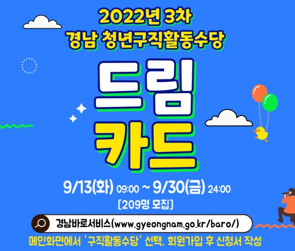 경남 청년구직수당은 구직을 위한 호라동 중에 있는 경상남도내 미취업 청년들에게 일정기간 경제적 지원을 하는 제도를 말합니다. 22년 3차 모집으로 15개 시군에서 209명의 청년을 선발합니다. 창원시,진주시,통영시,사천시,김해시,밀양시,거제시,양산시,의령시,창년시,남해군,하동군,산청군,함양군,거창군은 드림카드 신청하고 200만원 받길 바랍니다.