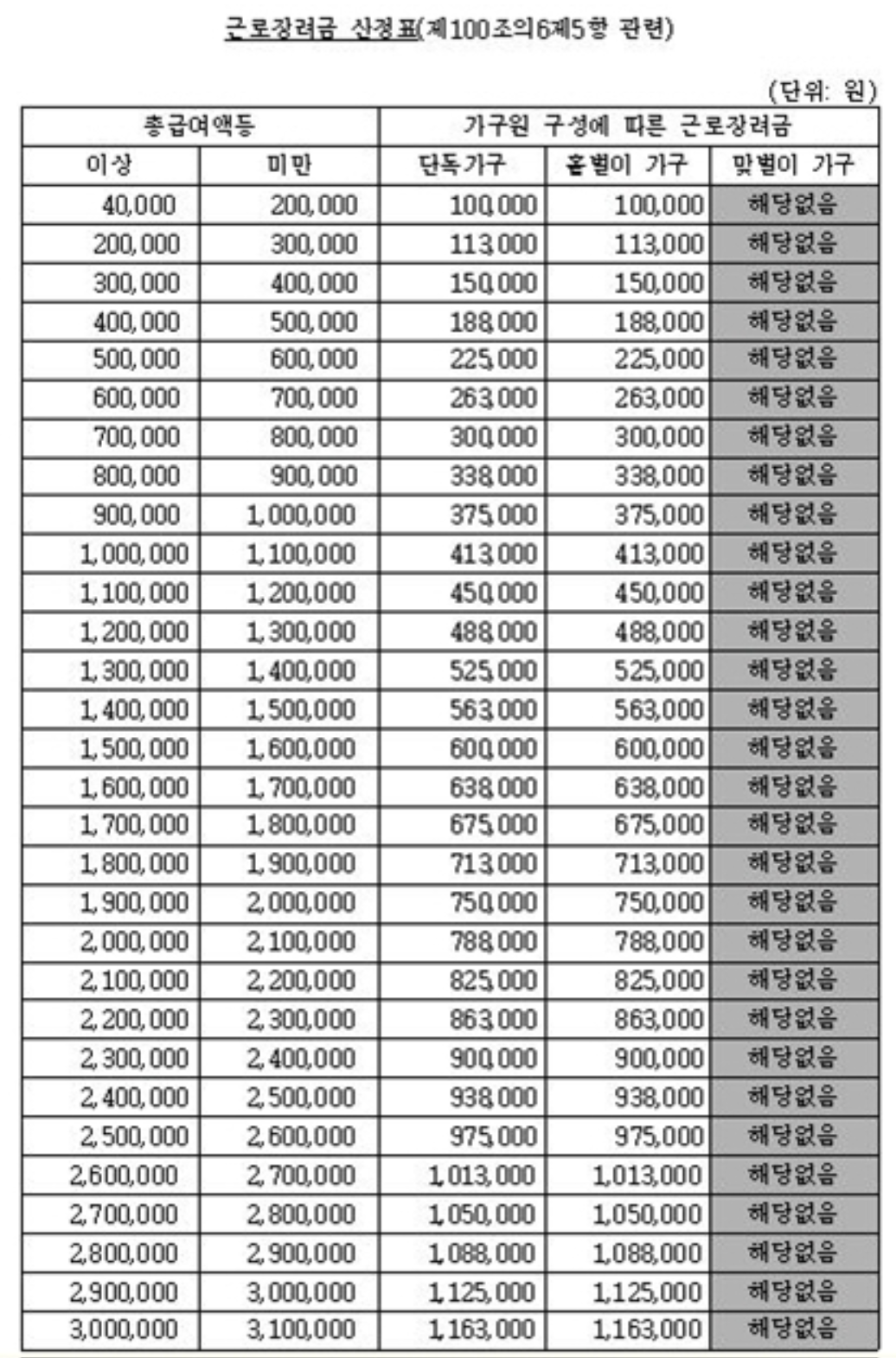 단독가구는 15만 ~ 52만 5,000원 / 가족 구성원이 몇명 되지만 실질적으로 소득이 있는 사람은 1명인 경우인 홑벌이 가구는 15만 ~ 91만원을 줍니다. 그리고 장려급으로 줄 돈이 15만원 미만이라면 6월에 주지않고 9월달 지급되니 참고바랍니다.