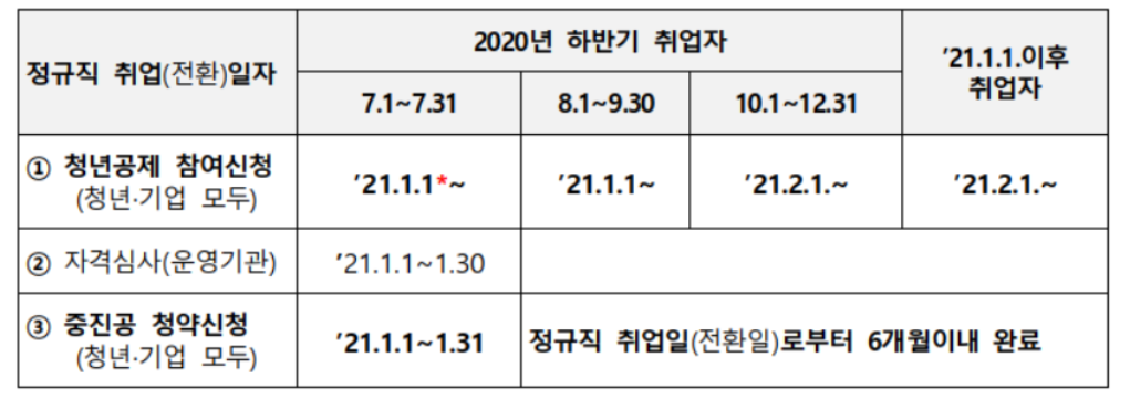 기업에 입사한 정규직 채용일로부터 6개월 이내로 하단에 표기한 신청방법대로 진행하면 됩니다. 단, 올해는 10만명이라는 모집인원이 한정되어 있기에 조금이라도 늦게 신청한다면 기회조차 못 얻을 수도 있으니 서두르시기 바랍니다.